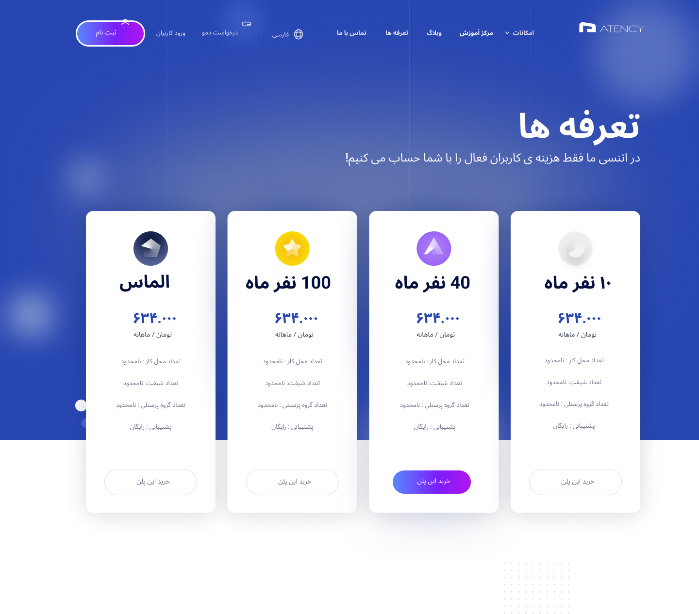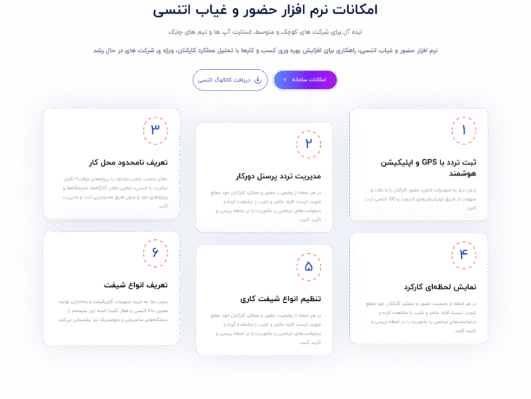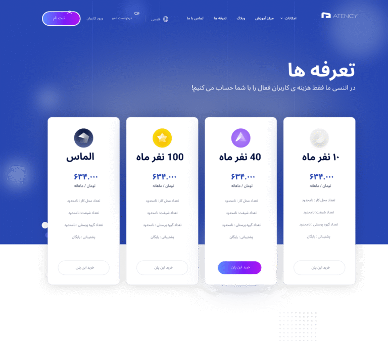 وب‌سایت اتنسی (Atency) با هدف معرفی نرم‌افزار هوشمند حضور و غیاب و مدیریت تردد پرسنل طراحی و توسعه داده شده است. این نرم‌افزار با تمرکز بر کنترل تردد پرسنل به شیوه‌ای دقیق و خودکار، امکاناتی مانند محاسبه خودکار مرخصی، مأموریت، غیبت و اضافه‌کاری را در اختیار سازمان‌ها قرار می‌دهد. همچنین، قابلیت ثبت ورود و خروج از طریق موبایل یا دستگاه حضور و غیاب از ویژگی‌های کلیدی آن است.
