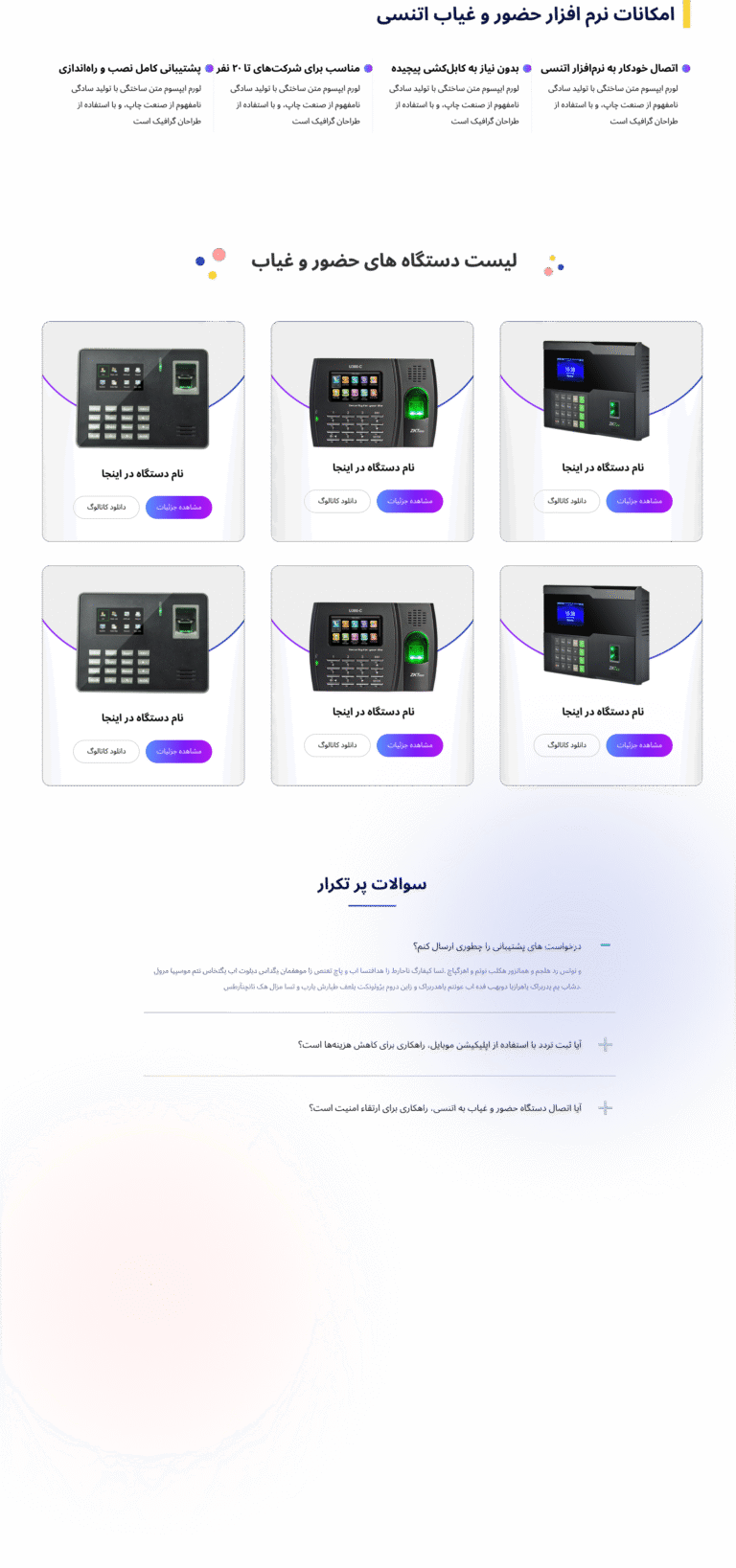 وب‌سایت شرکتی اتنسی با طراحی اختصاصی در Figma و پیاده‌سازی در وردپرس، بستری حرفه‌ای برای معرفی نرم‌افزار حضور و غیاب هوشمند فراهم کرده است. این وب‌سایت با ظاهری مدرن و عملکرد سریع، تصویری معتبر از برند اتنسی در فضای دیجیتال ارائه می‌دهد.