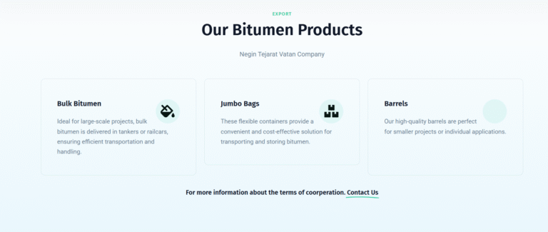 وب‌سایت نگین تجارت وطن با هدف معرفی خدمات و محصولات این شرکت در زمینه تولید، صادرات و عرضه انواع قیر صنعتی و نفتی طراحی و راه‌اندازی شده است. تمرکز اصلی طراحی سایت بر ارائه‌ی تصویری حرفه‌ای از برند و تسهیل ارتباط با مشتریان داخلی و خارجی بوده است.