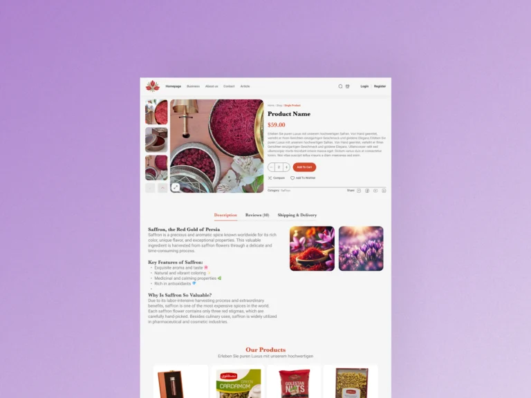 پروژه Safran یک طراحی رابط کاربری فروشگاهی لوکس و ترند با تم لایت است که برای بازار آلمان طراحی شده است. در این پروژه، تمرکز بر زیبایی بصری، ترکیب رنگهای ظریف و ساختار منظم صفحات است تا حس اصالت و کیفیت محصول بهخوبی منتقل شود. تصمیمهای UX با هدف سادهسازی مسیر خرید و افزایش رضایت کاربر اتخاذ شدهاند. این پروژه شامل ۷ صفحه است و در دو سایز برای موبایل و دسکتاپ طراحی شده. مهارتهای UI Design، UX Design، طراحی گرافیکی و طراحی تعاملی در خلق تجربهای منحصربهفرد، روان و حرفهای برای کاربران بهکار رفتهاند.